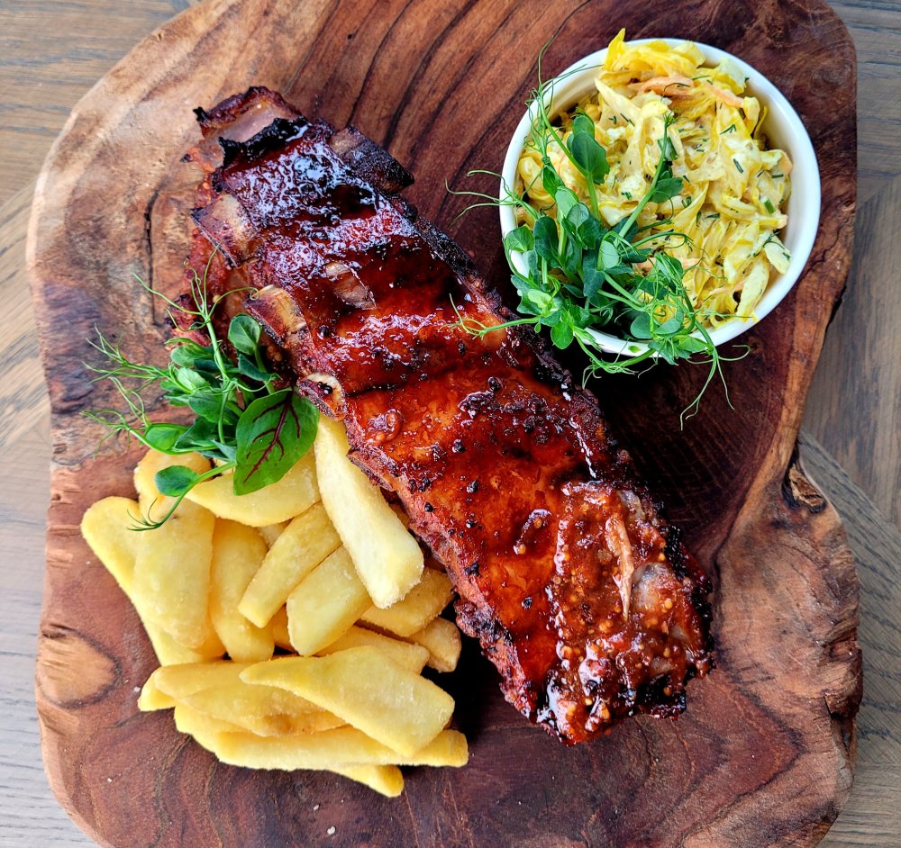 żrberko / sos BBQ / frytki stekowe / sałatka colesław
