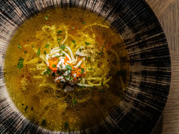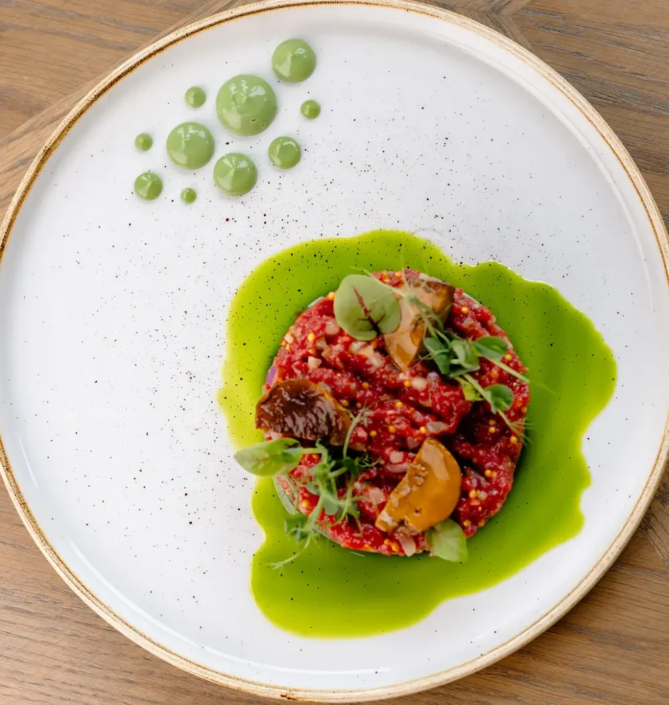 polędwica wołowa / leśne grzyby / żółtko / cebula / pikle / majonez lubczykowy / pieczywo
