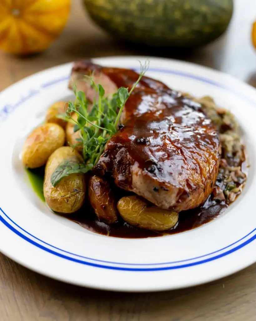 bekon stek / ziemniaki konfitowane / kapusta zasmażana /sos demi glace / szczypior