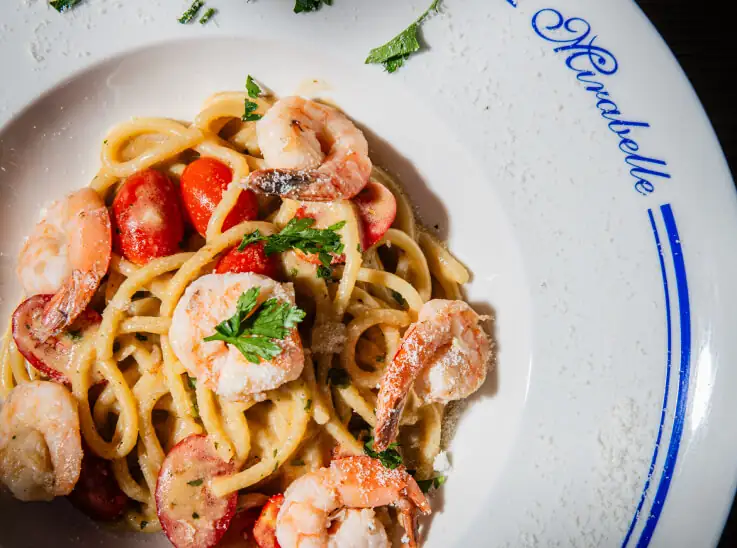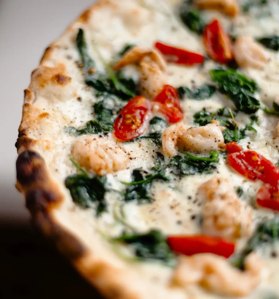 mozarella di bufala campana d.o.p. / pomidorki koktajlowe / szpinak baby / krewetki / biały sos z nutą cytryny