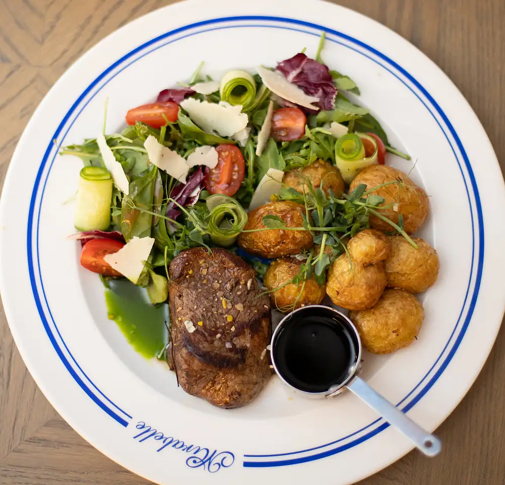 stek wołowy / ziemniaki konfitowane / rukola / pomidorki koktajlowe / parmezan / sos balsamiczny