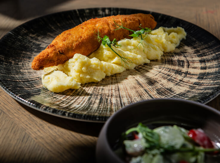 kotlet de volaille / puree ziemniaczane / mizeria / sos cafe au lait