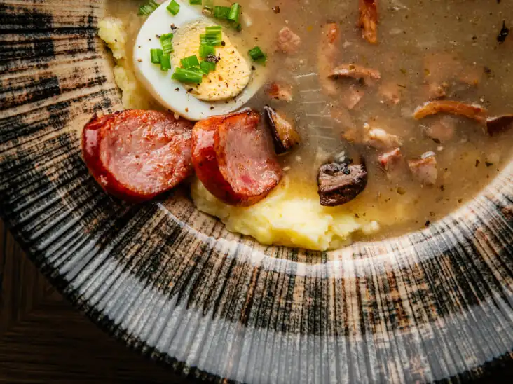 na żytnim zakwasie / purée ziemniaczane / kiełbasa śląska / jajko