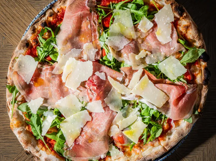 pomidory san marzano d.o.p. / pomidorki koktajlowe / fior di latte / bazylia / rukola / culatello d.o.p. – serce szynki parmeńskiej / płatki grana padano / oliwa tenute fierro