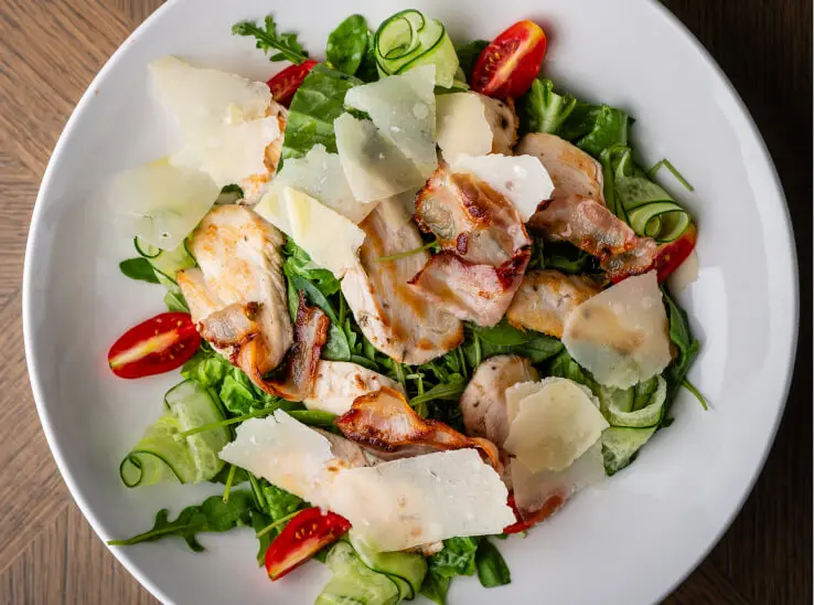 pomidorki koktajlowe / ogórek / kurczak / boczek / parmezan / sos z anchois